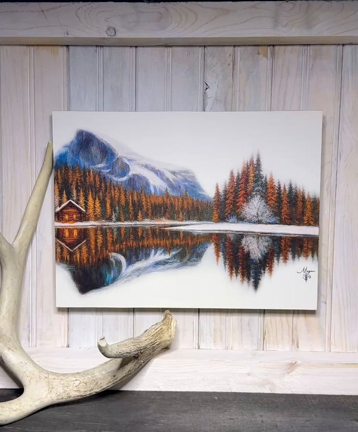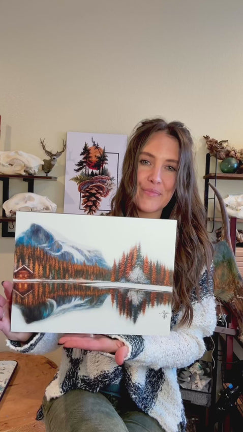 Originally painted in watercolor, this artwork brings together the warmth of timber, the calm reflection of the lake, and the peaceful solitude of cabin life. It’s a reminder of slower days, deep breaths, and evenings spent watching light fade across the water.